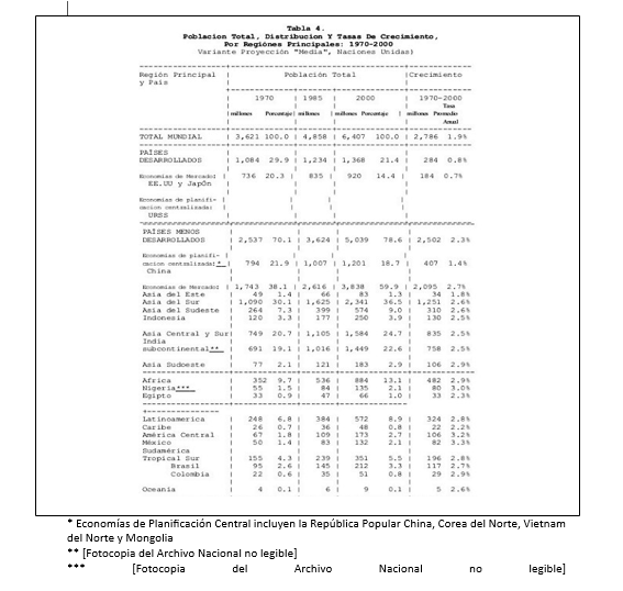 Las estimaciones de las Naciones Unidas utilizan la población de 1970 de 3.600 millones como base (hay casi 4 mil millones ahora) y proyectan entre 6 y 8 mil millones de personas para el año 2000 con una estimación media de los EEUU de 6.400 millones. Las proyecciones medias de los EEUU muestran una población mundial de 12.000 millones para el año 2075 lo que implica un incremento de 5 veces en el Sudeste de Asia y América Latina y un incremento de 7 veces en África, comparado con incremento de 2 veces en el Este de Asia y un incremento del 40% en los países desarrollados (ver Tabla 1). La mayoría de los demógrafos, incluyendo los Consejos de Población de las Naciones Unidas y de los Estados Unidos creen que 10 a 13 mil millones es el nivel más probable de estabilidad poblacional mundial, aun con esfuerzos intensivos en control de fertilidad. (Estas proyecciones asumen que suficientes alimentos pueden ser producidos y distribuidos para evitar limitaciones causadas por hambrunas.)